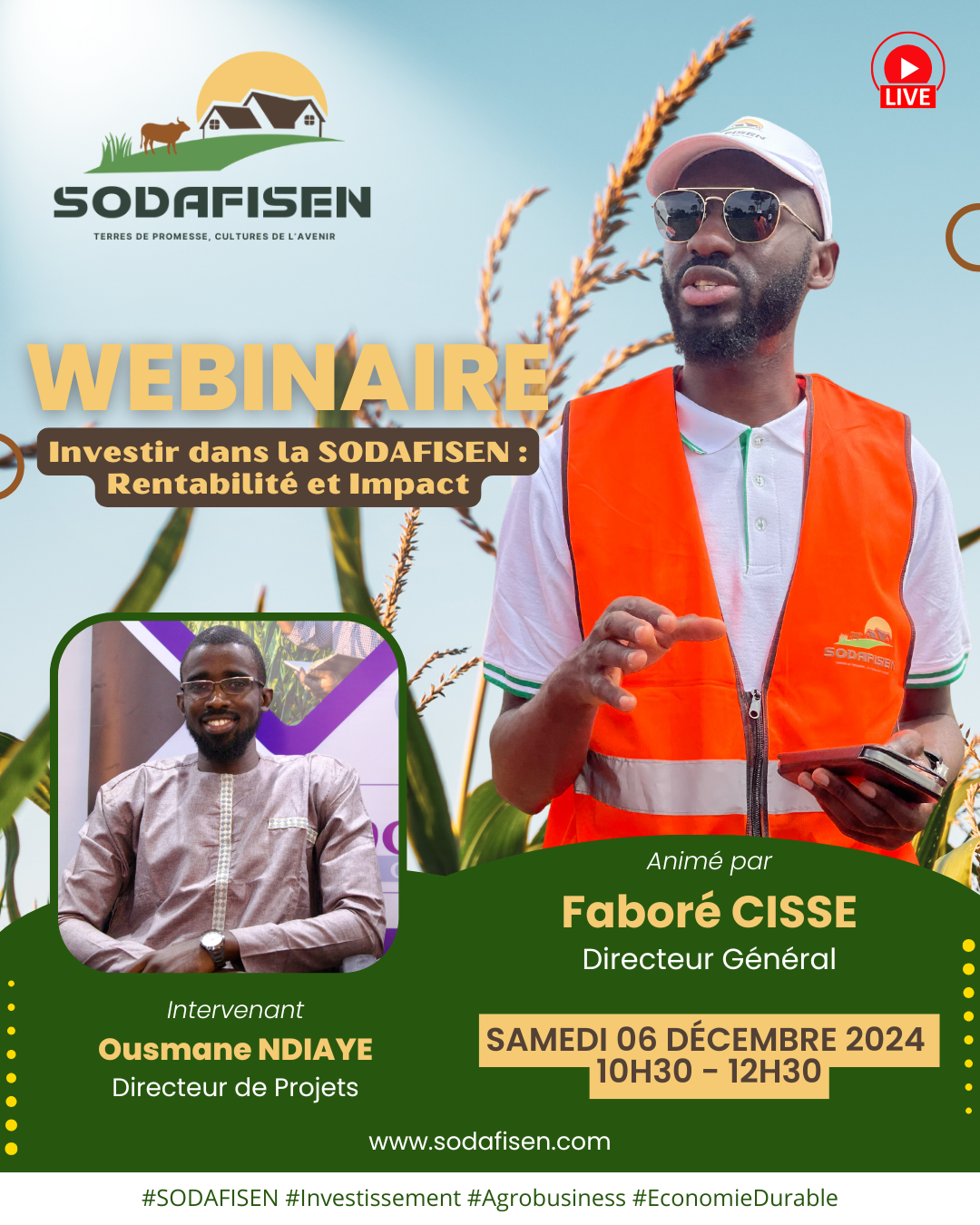 La SODAFISEN a le plaisir de vous inviter à un webinaire exclusif, dédié aux potentiels investisseurs et à toutes les personnes intéressées par les opportunités dans le secteur de l’agrobusiness.